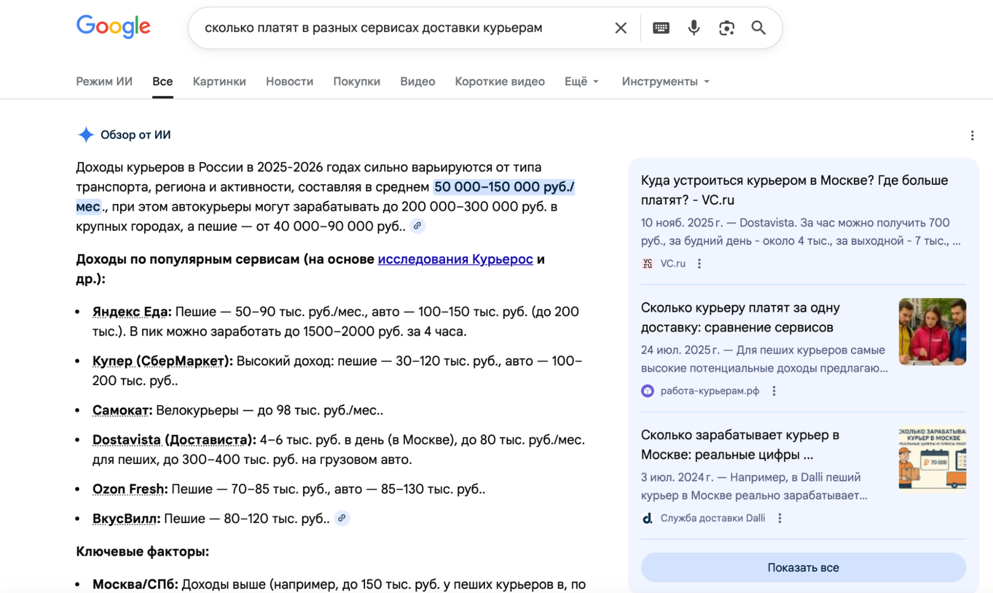 Шаг 7. Собираем семантику через уточняющие вопросыПродолжайте разговор — задавайте уточняющие вопросы («А у курьеров Яндекс Еды нормально платят?»). Каждый новый вопрос — новый поисковый запрос GPT. Обновляйте страницу, повторяйте процесс, собирайте семантику.