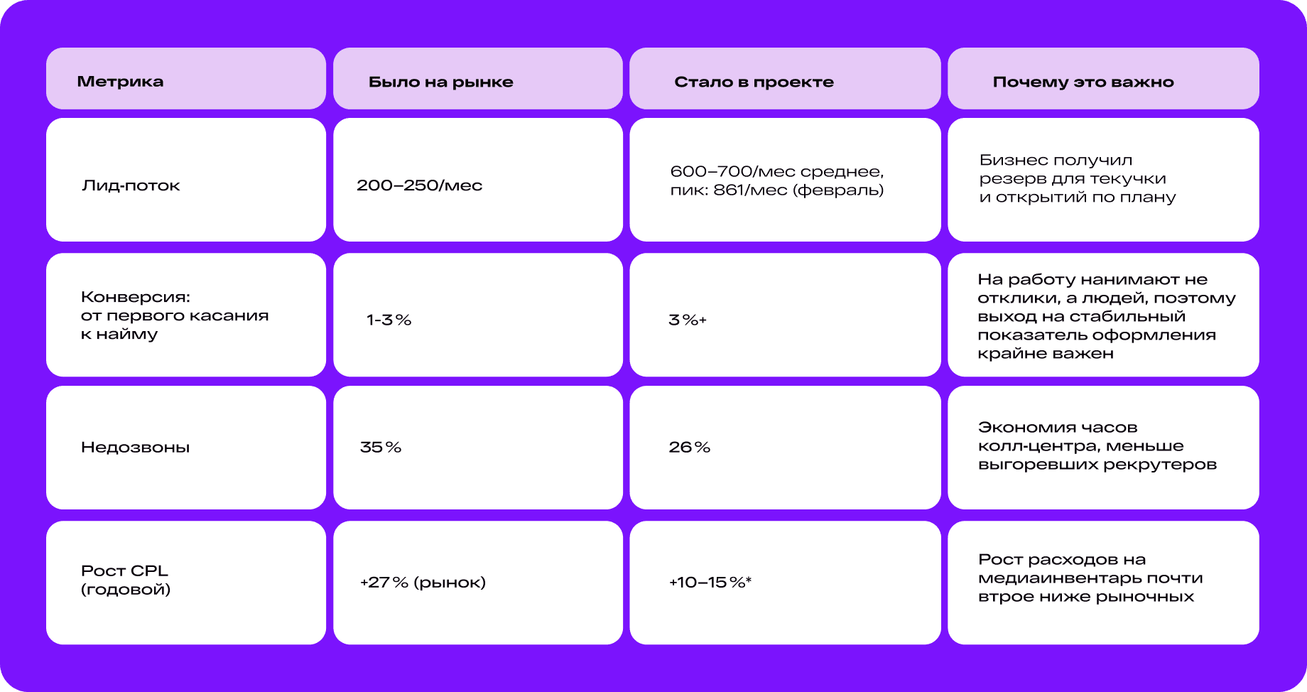 Квалифицированных лидов за год: 8 400. Это значит, что восемь тысяч человек в Москве подтвердили намерение работать в магазинах — и были переданы клиенту.