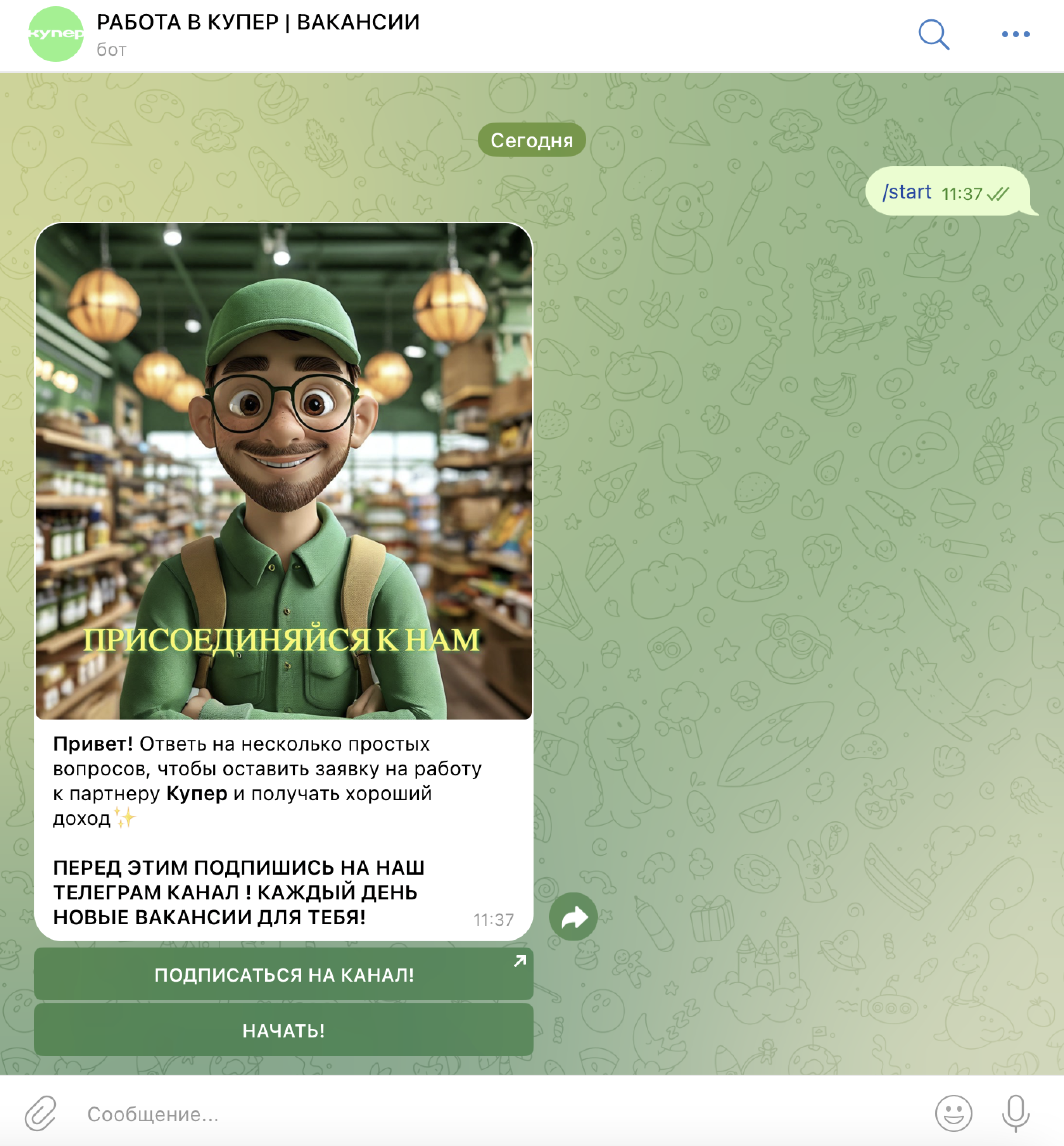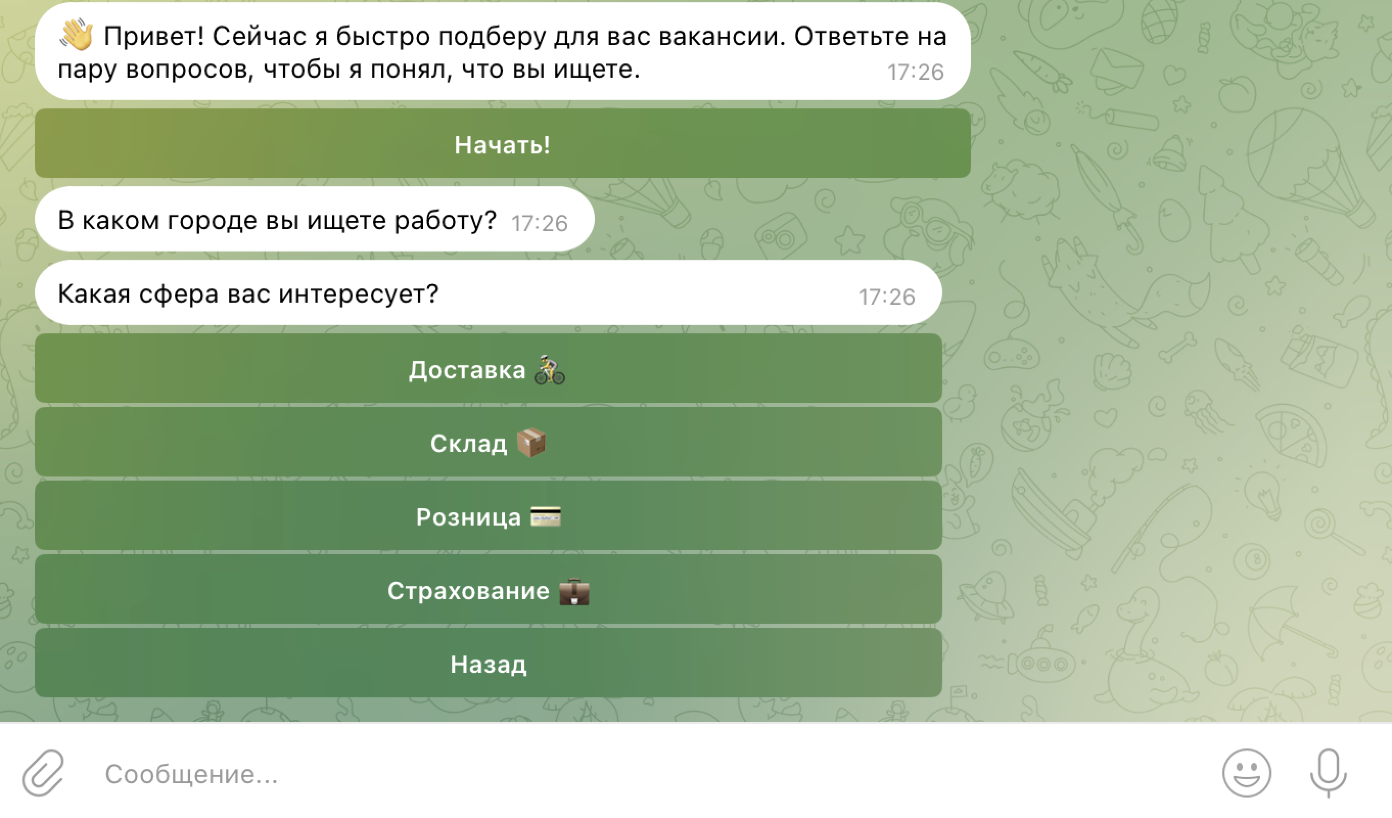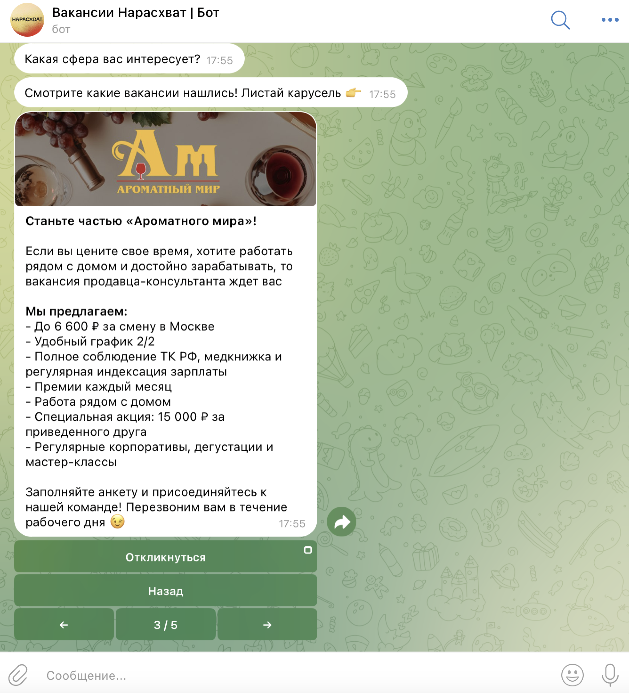 Например, для целей лидогенерации на HR-офферы нативный интерфейс Telegram Mini-app можно использовать как лидформу ВК: картинка + название вакансии + условия и описание + поля анкеты как на сайте / в лидформе.