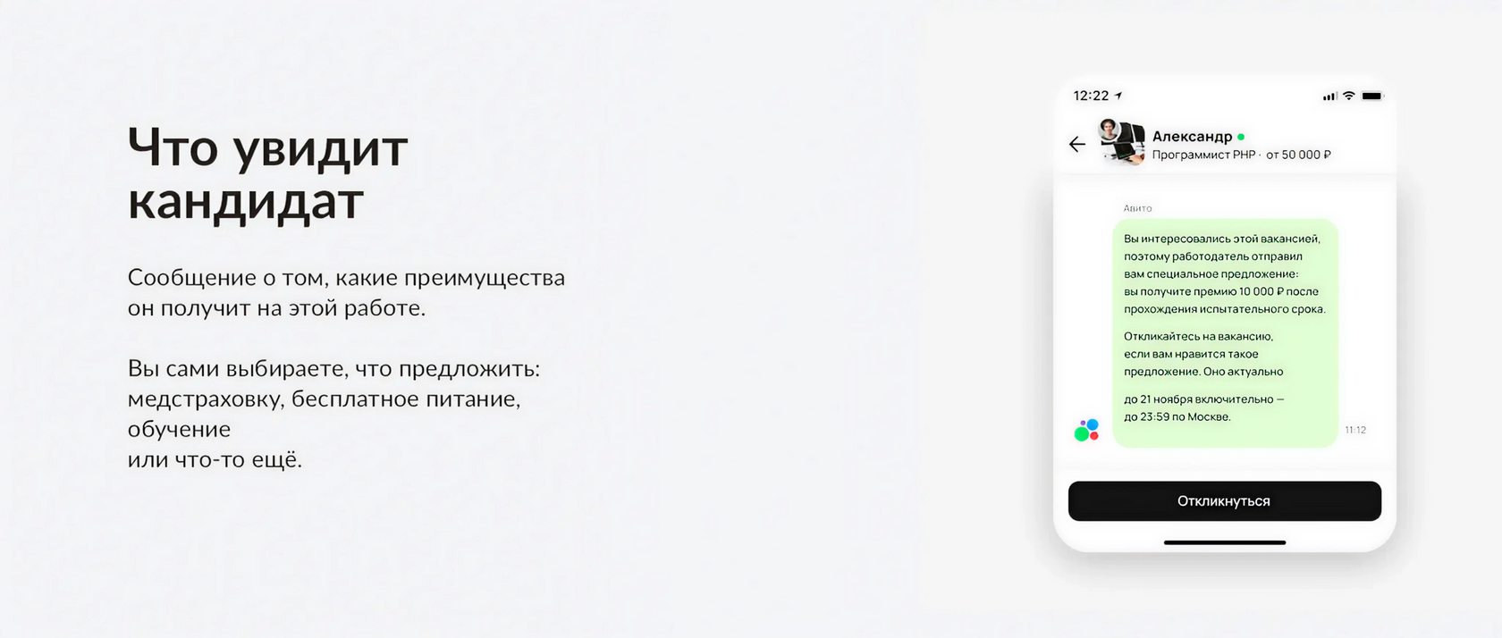 5. Рассылки соискателямВ отличие от других инструментов, на Авито Работе рассылка идет сразу в мессенджер кандидату, а не на почту — это значительно увеличивает эффективность.